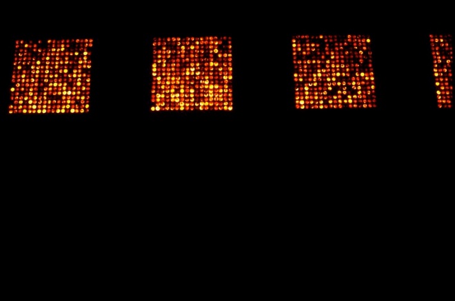 This installation installed at the Old Seager Distillery, Deptford London, for Deptford X Festival 2003, comprised of 5000 used cigarette ends. These were installed into blacked out windows to parody a cathedral's stained glass. Sunlight filtered through the cigarette ends transmitting a glorious and shimmering orange glow into a vast dark space.
