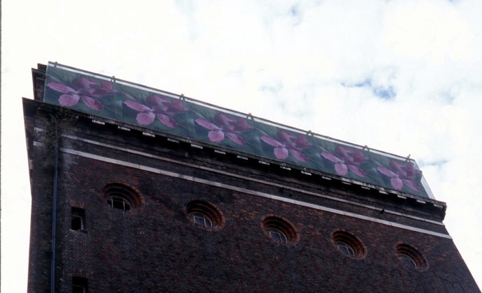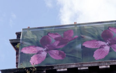 Two translucent banners 17mtrs x 3mtrs, printed with repeat images of Deptford Pink flower. Sited at a high level to maximise visibility and suggesting an association with sky, floating and ethereal existance.