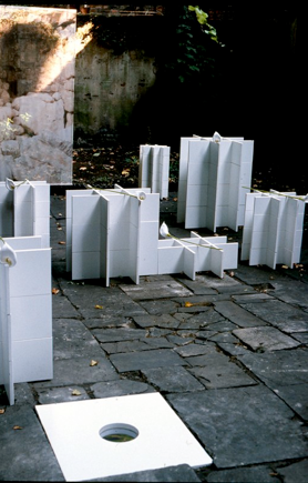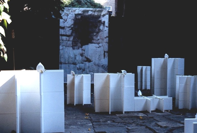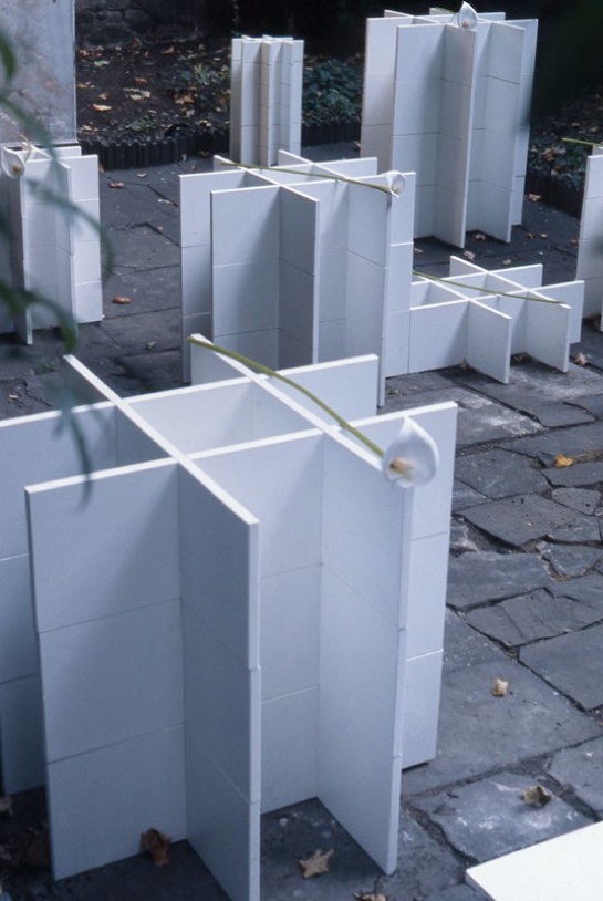 This installation was inspired by an exhibition seen at the Musee d'Orsay, Paris. This brought together a small collection of paintings by Gustave Courbet on the theme of 'The Source' with the infamous painting 'Origin du Monde' (Origin of the World), providing the focus for the collection. The paintings are of dark cavernous spaces showing sources of rivers and their juxtaposition with the vagina as the source of life. These entrances, openings are full of sexuality, but carry a foreboding, a return to our origins. The installation is also influenced by the form and identity of the grave, and especially war cemetries. Repetition, geometry, void, the forbidding, influence and inform the structure of the work.