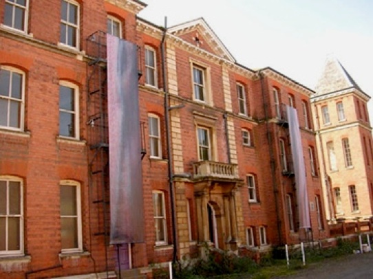 A small photo fragment of a human vein 3 cm was enlarged to monumental proportions. It explored an anatomical image while revealing relationships with buildings, structure, landscape, and energy. There are primal parallels with fluidity, life source, river, geology, sap, pulse, flow, eros, life cycles and the primitive force of existence. The image is translucent, subtle, visually at one with the architecture, fabric and past narrative of the building.e documentation shows 2 photo printed banners commissioned for Worcester Royal Infirmary. The specific building housed the hospitals' doctors and has been acquired by University College , Worcester for renovation